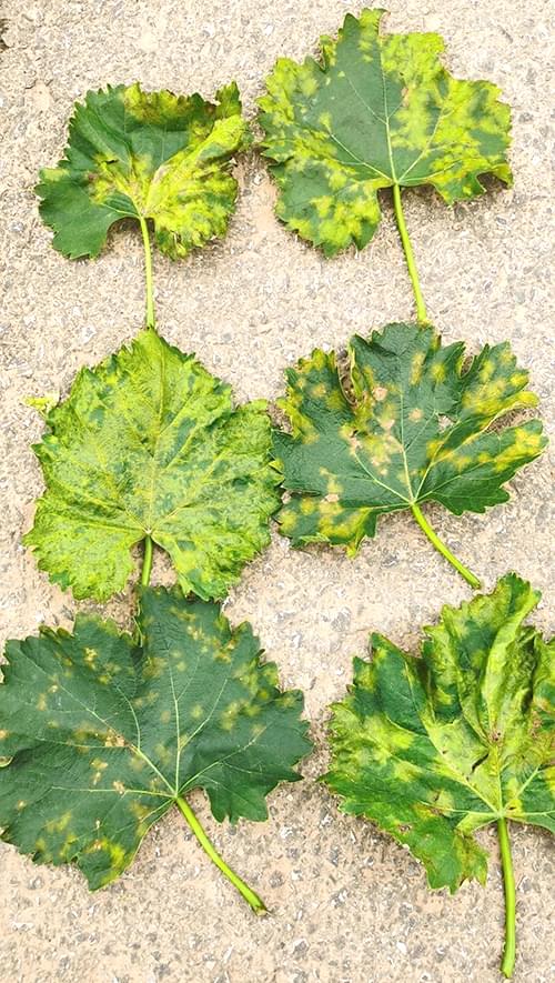 2、预防叶片霜霉病时,使用安洗(40%烯酰吗啉1000倍)+云保泰(45%唑醚·甲硫灵1500倍)全株喷雾;葡萄霜霉病发生时,使用道泽(48%烯酰·氰霜唑750倍)+阿米达(35%苯甲·嘧菌酯1500倍)全园喷雾,三天后喷施特别特(24%唑醚·氰霜唑750倍)+安洗(40%烯酰吗啉750倍)再次全园喷雾。