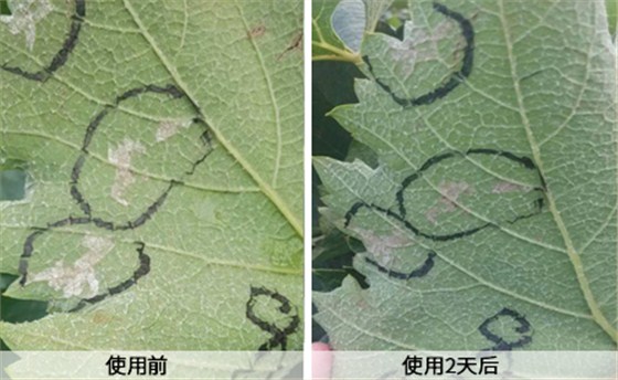 河北省辛集市张古庄镇张古庄村,农户春祥,巨峰葡萄转色期,突然葡萄霜霉病爆发,特别特750倍处理,7天后观察病斑已经变干,无二次侵染,防治葡萄霜霉病持效期长。